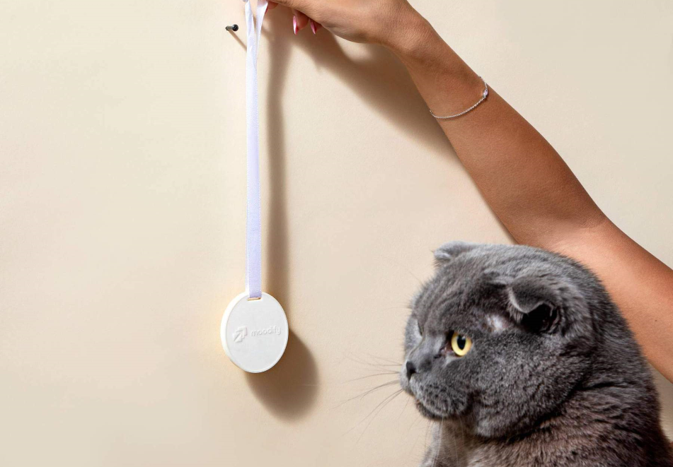 Moodify is cat litter odour eliminator, it's a pendant that you hang above the litter tray, it's made of clay and are impregnated with a unique malodour control solution, based on patented technology, which achieves a cancelling effect that is faster, smarter, more efficient, less intense and much more pleasant than other solutions
